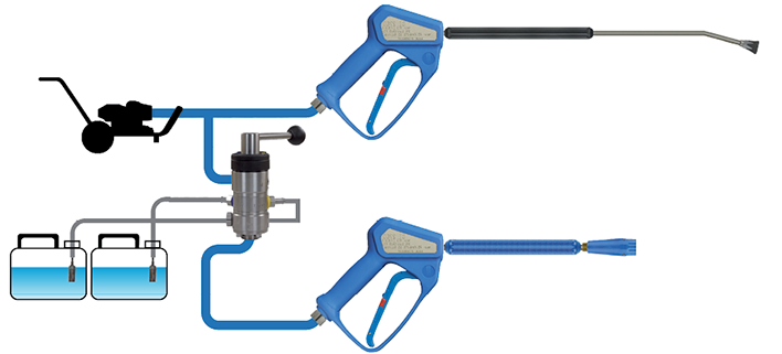 This EzyFoam system is used when two chemicals are required. This system is ideal when used in fast pace applications such as refrigerated truck cleaning, dealership courtesy cleaning, hand car washes or in operations where it is not desirable to switch accessories.